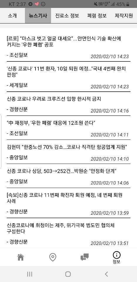 어플 내에서 실시간으로 다양한 뉴스를 업데이트 하고 있어 현재 코로나바이러스에 관한 정보도 쉽게 얻을 수 있습니다.