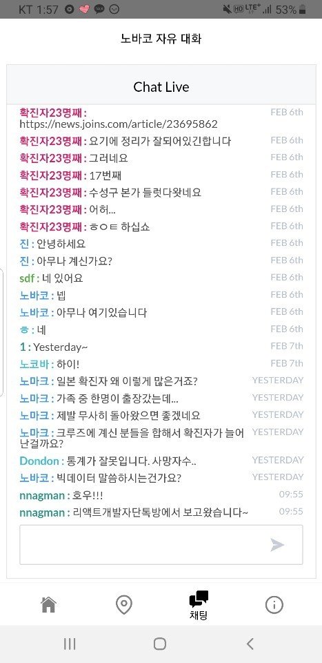어플리케이션을 사용하는 이용자끼리 코로나바이러스에 관하여 실시간으로 대화를 통해 정보 공유가 가능합니다. 또한 개발자와의 피드백을 통해 실시간으로 데이터 수정도 가능하다는 점이 특징입니다.