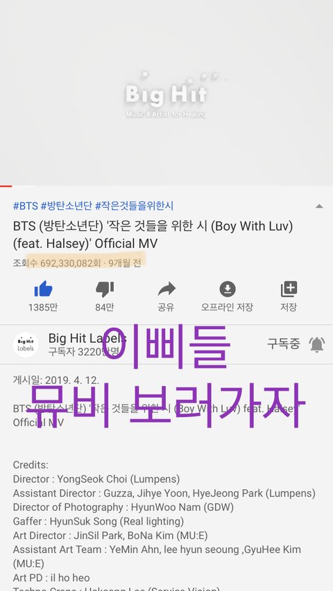 팬톡에 글 언제썼는지 물어보는 글에 작은시3억뷰라고 글쓴거 확인하다가 작시뮤비 지금은 얼마나 봤는지 보러다녀왔거든 작시 7억뷰가 코앞이야 이삐들~~ 시간날때 뮤비도 한번씩 보고오자 이삐들 항상 고맙고 사릉흔다~~^^