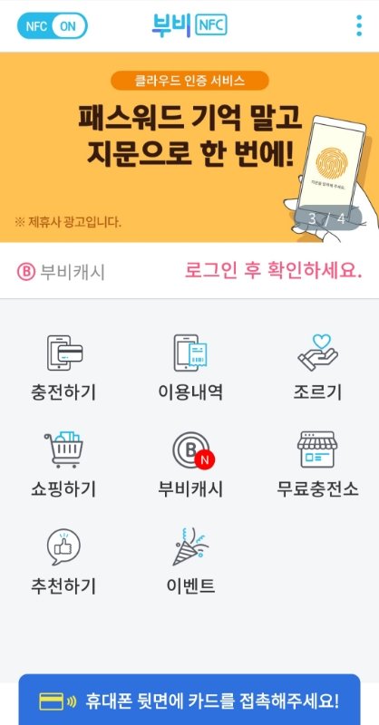 여기서 폰에 있는 NFC기능을 키고 폰 뒷면에 카드를 붙여. 앱에서 시키는대로 하면 돼