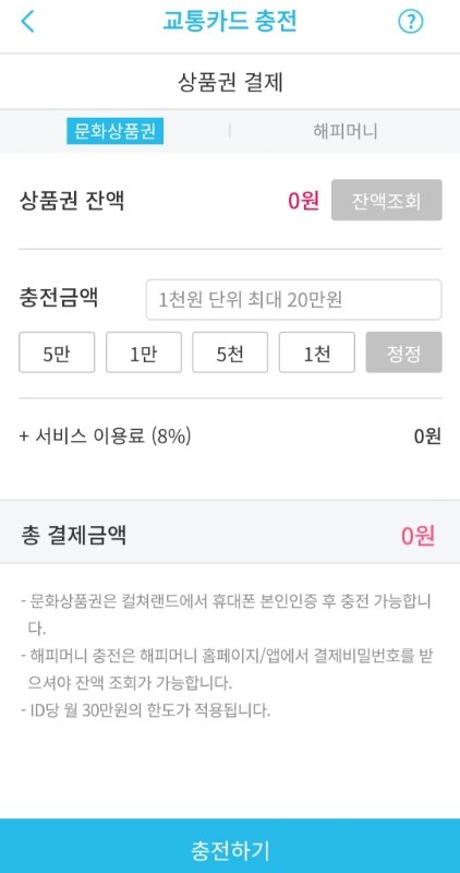 그 다음은 교통카드에 충전할 금액을 선택해줘. 서비스 이용료는 좀 비싸지만ㅠㅠ 난 다른 방법이 없었어