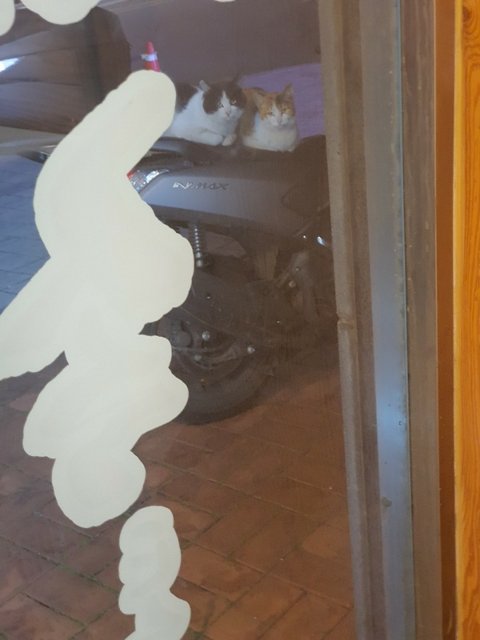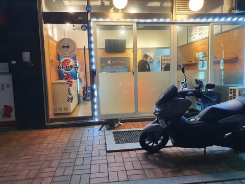 배달오토바이에 올라앉아서 왜밥안주냐며 노려보네요
