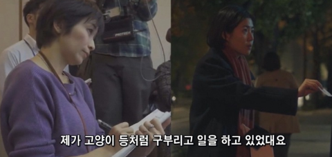 일본 여기자가 고양이 등처럼 구부리고 일을 하고 있었다며,