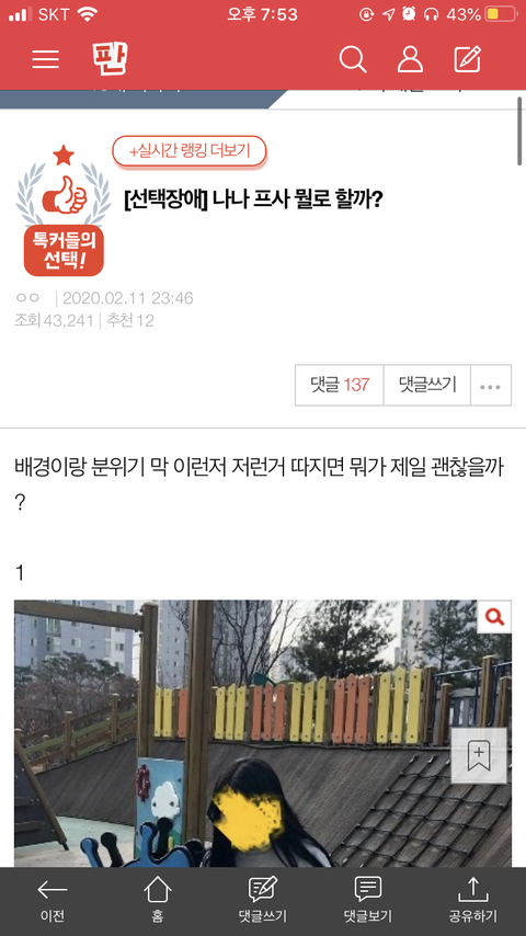 제가 친구에게 에스크로 연락받고 알게되었어요 제사진이 여기서 사진 골라달라며 도용당하고 있었어요 저는 댓글에서 다리가 두껍다고 욕먹었구요 제발 신고 한번만 부탁드려도될까요ㅠㅠ 도와주세요ㅠㅠ “나나 프사 뭘로 할까??” 라고 치면 나와요 다 제사진들입니다 걔다가 제 친구도 나와있구요 제발 신고좀 부탁드릴게요ㅠㅠ