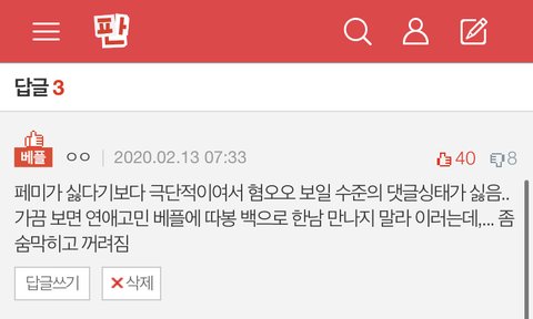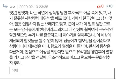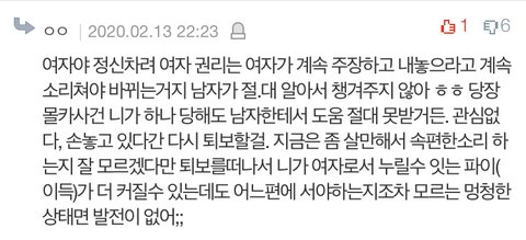 코르셋 강요가 싫다는 베스트 글에 댓글 남긴 여자야. 나도 원래 페미니즘을 지지했었는데, 점점 여성인권을 존중 받자는 사상과는 전혀 상관없는 억지스러운 남성혐오 조장을 자주 보게 되서 지금은 나 자신을 페미니스트라고 칭하는게 꺼려진다.