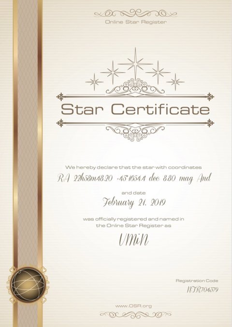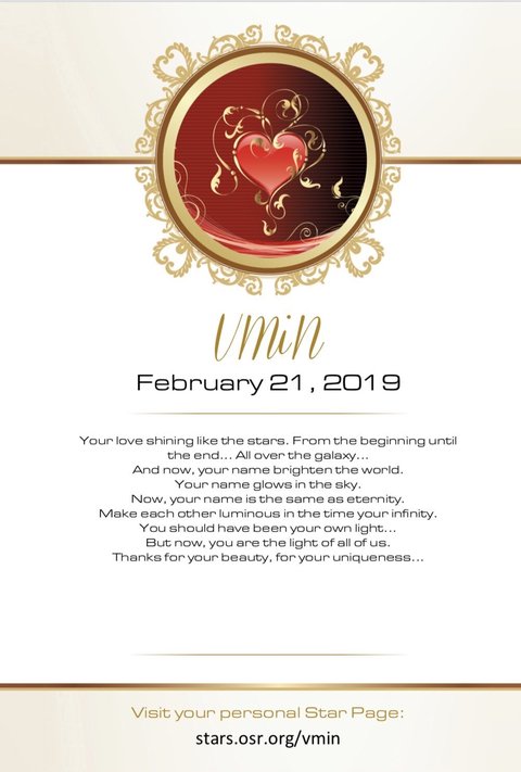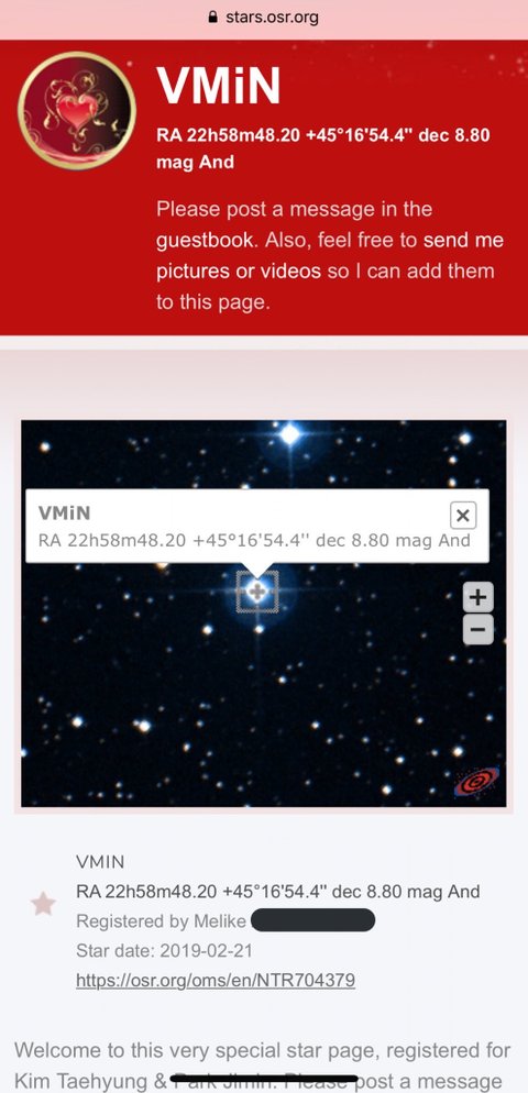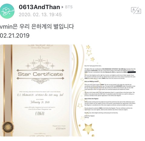 작년에 해외팬들이 구오즈를 위해서 별에 Vmin이라는 이름 붙여주거 증서 받았었는데 그걸 팬이 포스팅 했나봐 응원봉 누름 이쁘니 ㅠㅠㅠㅠ
