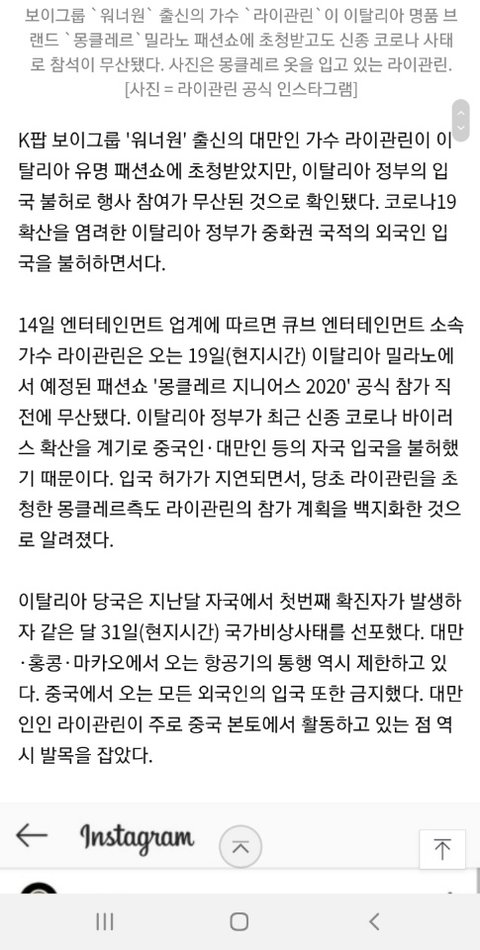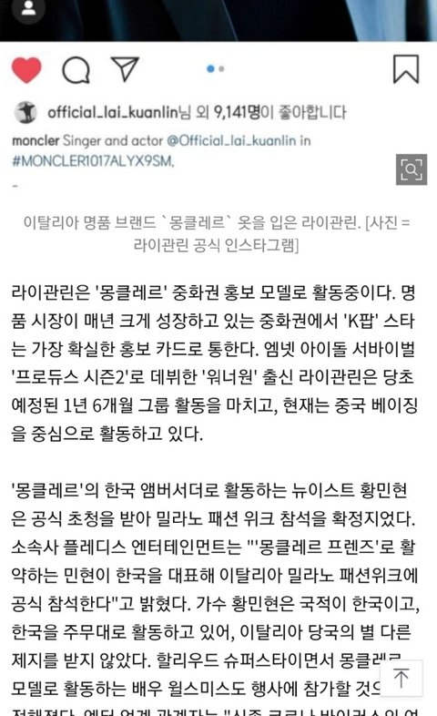 황민현&라이관린 밀라노에서 열리는 몽클레르행사 둘다 초청받아서 참석하기러했는데 관린이 아무래도 활동 주무대가 중국이라서 취소됐대...