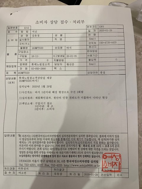 결국 제품은 심의를 위해 다시 '여* 소*자 연합' 으로 넘어갔고 결과, "원단의 인장 견뢰도가 미흡하여 나타난 현상" 으로 결과를 받았습니다.