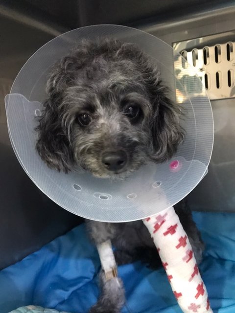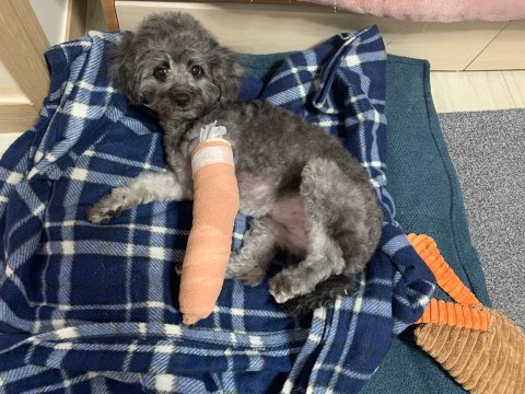 토이푸들이 목욕하는 도중에 뛰어내려서 앞다리를 절고 있다고 매장에 와달라고 하여