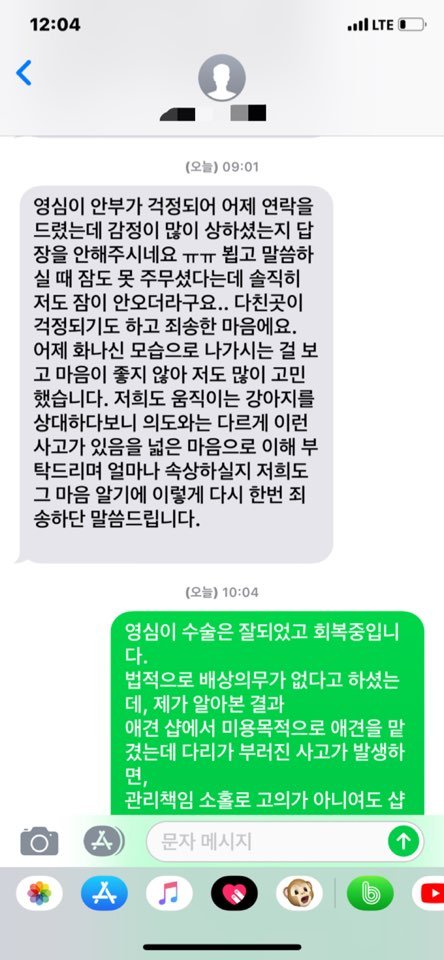 혹시 이런경우에는 배상같은거 어떻게 하는지, 저같은 경우처럼 병원을 찾은 견주들이 있는지 여쭤봤고 원장님은 고의는 아니였어도 주의태만으로 이부분은 매장에서 보상해줘야 한다고 들었습니다.