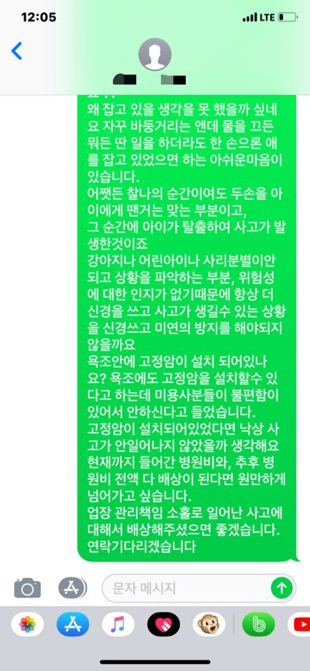 그리고 매장에서 저에게 영심이 현재상태에 걱정도 하고, 미안한 마음에 문자를 보내주셨습니다. 많이 고민하셔서 문자 주신거 같은데 결국 문자내용에는 제가 이해해주길 , 그리고 매장내에서 아이가 다쳐서 속상한 마음 충분히 아니 죄송하다는 말뿐입니다.