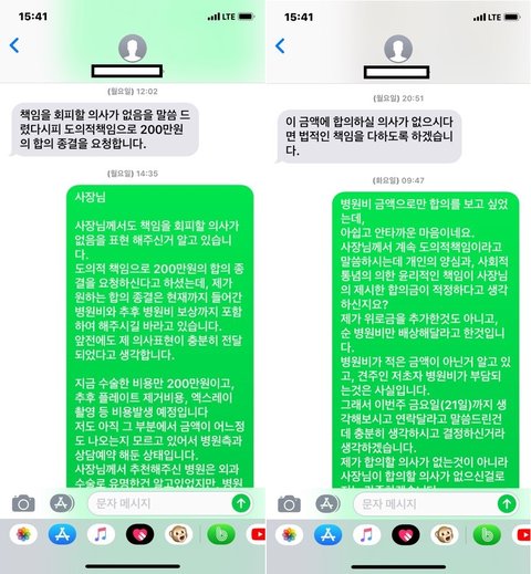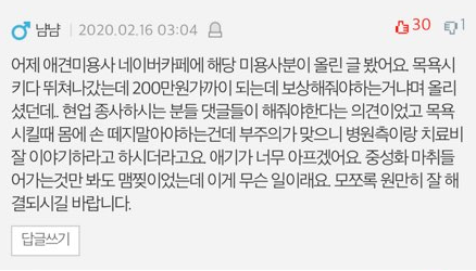 그리고 댓글보다가 애견미용사 카페에 해당미용사분이 글을 기재하셨다고 올린 댓글도 봤습니다. 제가 직접 본것은 아니여서 내용은 모르겠는데 그러면 사장님도 제가 글을쓴걸 보셨을수도 있네요? 저 합의 하고 싶어요 사장님. 2/21까지 연락기다리고 있을께요 답장주세요