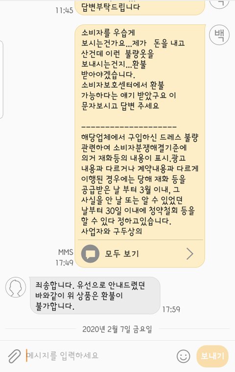 불량 옷 보내놓고 교환, 환불, 수선 아무것도 안된다고 배째라식...