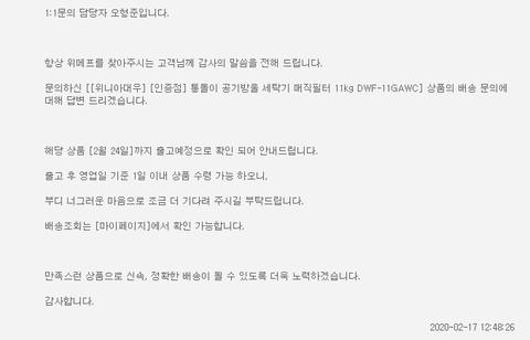 위니아대우면 해외제품이 아니고 국산이죠? 구매후기엔 다 1~3일 만에 받았는데