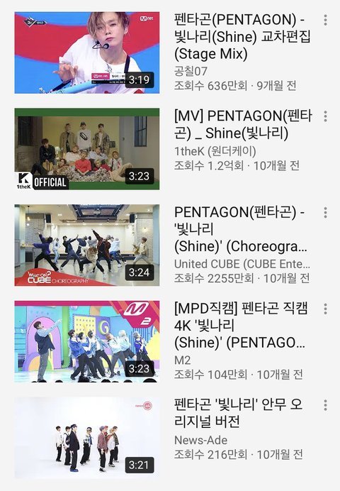 ●진짜로 역주행한 펜타곤-빛나리 역주행 당시 초기 뮤비조회수 1억2천까지 급증. 그에비해 빛나리보다 음싸 순위가 훨~씬 더 높았던 엔플라잉 초기 뮤비조회수는 처참했음(뮤비조회수는 사재기 할 생각을 못했나봐?) 뮤비배급사는 둘다 원더케이.