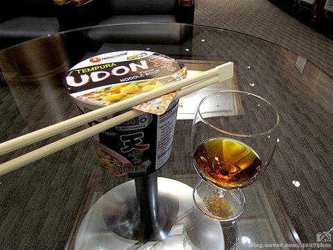 라운지에서 뒹굴거리다가 비행기 타기 전에 레미 마르탱 XO를 조금 따라서 튀김 우동을 안주삼아 호로록 마셔줍니다.