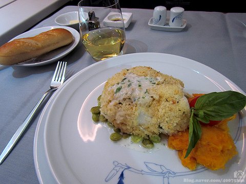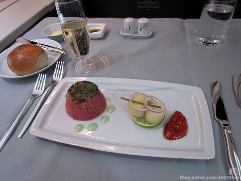 첫째는 주변 환경. 일반석에서 받게 되는 조그만 플라스틱 용기에 담긴 3분 요리와 비교한다면 일등석 기내식은 훨씬 더 맛있다는 걸 아무도 부정할 수 없을 겁니다. 게다가 하늘 위에서 먹는 만찬이라는 사실은 똑같은 음식이라도 뭔가 고급스럽고 희소성이 있는 특별한 음식을 먹는다는 느낌을 마치 향신료처럼 팍팍 뿌려줍니다. 제가 음식의 맛을 평가하는데 있어서 굉장히 중시하는 여섯번째 감각 - 즉 사회문화적 경험이라는 게 엄청난 위력을 발휘하는 식사였습니다.