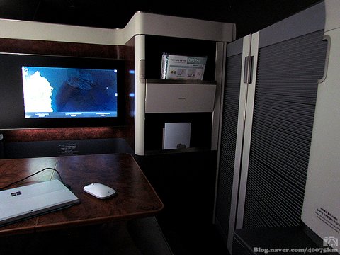 노트북 펼치면 키보드가 절반 이상 테이블 밖으로 삐져나오기 십상이었던 일반석에 비하면 퍼스트 클래스의 테이블은 노트북은 물론이고 여기에 책 한 두권 펼쳐놓고 A4 프린트물 몇 장 뿌려서 뭔가 중요하고도 심각한 작업 하는 척 하기 딱 좋을 정도입니다.