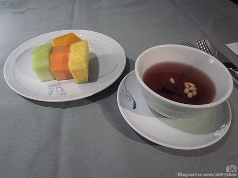 마지막의 마지막으로 모듬 과일과 오미자차로 마무리 합니다.