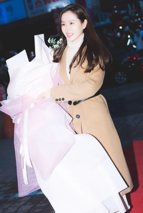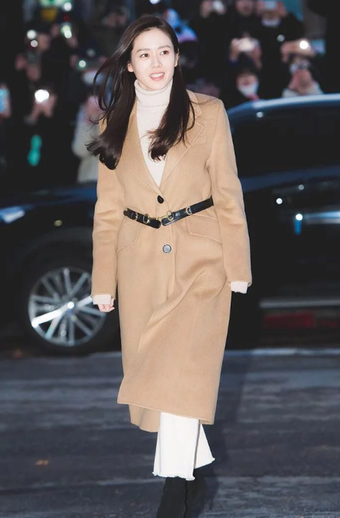 이 날 손예진은 베이지 터틀넥 니트에 크림진을 매치,