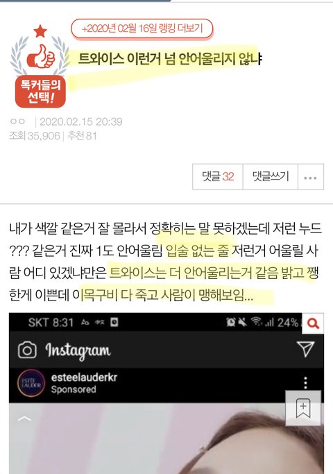 악플에 좋아요 몇백개씩 눌러져 있는거 보면 진짜 대단하다는 생각이 든다 참 ㅋㅋㅋㅋ