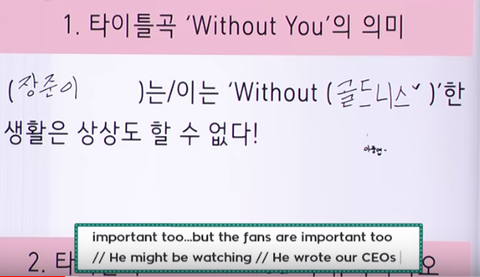 저 장준 같은 경우는 공통적인 대답일 수 있겠지만 without 골드니스(골든차일드 팬덤명) 없는 생활은 할 수 없습니다. // 진행자 : 아~ 드디어 저희가 원하는 대답이 나왔네요ㅋㅋㅋ 한 명 더 들어볼까요?