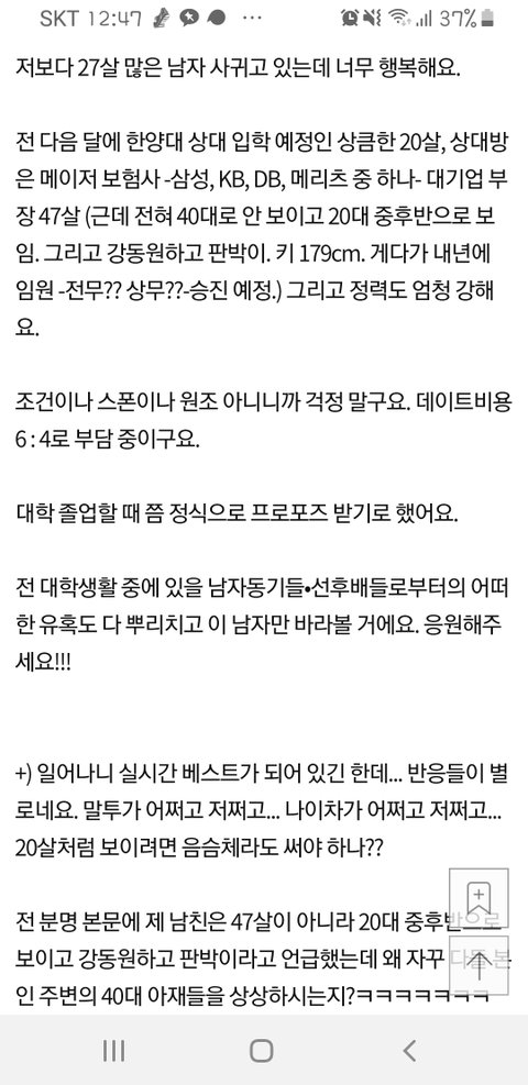 전 올해 한양대 상과대학 입학예정인 20살 여자구요. 남자친구는 올해 47살 메이저 보험사 (삼성, 메리츠, KB, DB 중 하나임) 임원 승진 예정자에요 (나이 숫자만 47일 뿐이지, 액면가는 20대 후반이구요. 강동원하고 싱크로율 백퍼!!!) 대학 졸업 임박하면 프로포즈 받을 예정일 정도로 진지하게 만나는 사이. 사귄지는 3개월 됐네요.