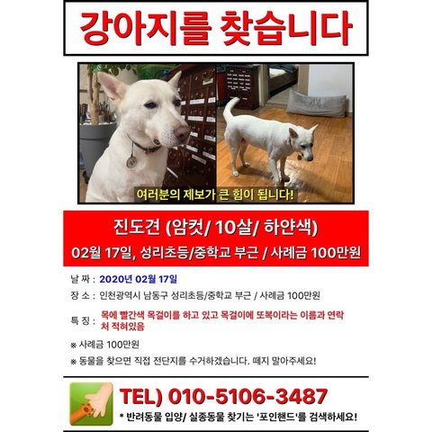 첨부 전단지 보고 비슷한 개 보시면 경찰서나 구청, 보호소 등에 꼭 신고해주세요.