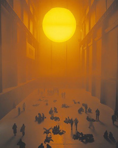 런던에 테이트 모던(tate modern) 에서 'weather project '로 인공태양을 전시실에 두고 마치 전시를 보러 온 사람들이 비치에서 일광욕을 즐기는 듯한 전시로 화제를 모은 아티스트입니다~ 전시 모습~