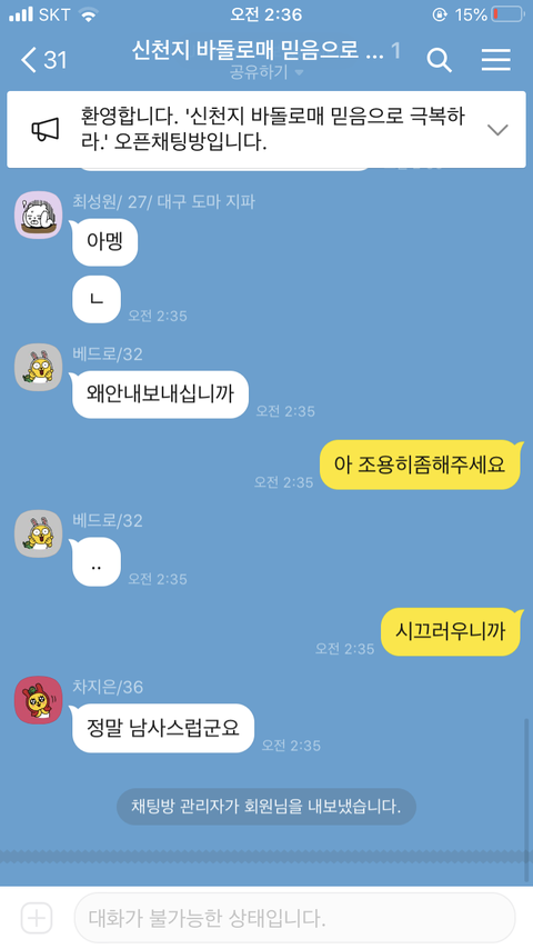 악귀 어린것들 ㅇㅈㄹ하며 방장한테 강퇴하라고함