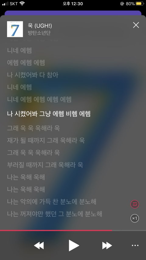 나 방탄 노래 너무 좋아서 전곡 무한재생 중인데 욱! 노래 가사 중에 에헴에헴 하는 부분에서