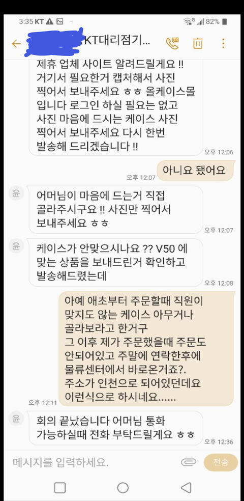 그리고 한 일주일전, 케이스가 너무 안와서 엄마가 전화를 하셨습니다. 토요일 저녁에 전화를 하셨는데 엄마가 너무 늦게 전화를 해서 케이스를 폐기 시켰다는겁니다. 그래서 엄마가 케이스가 왔다는 문자 한 통도 안줬으면서 왜 폐기시켰냐고 했더니 거기서는 문자 한통 달라고 했어요? 라고 하는겁니다. 요즘 사람들이 문자보내는 걸 싫어해서 안 보낸다는 말도 핑계를 대면서요. 엄마가 그걸 듣고 사람들이 케이스 왔다는 문자 한통으로 사람들이 극대노를 하겠냐고 계속 뭐라 했더니 갑자기 케이스를 찾았다면서 보내주겠다고 했습니다.