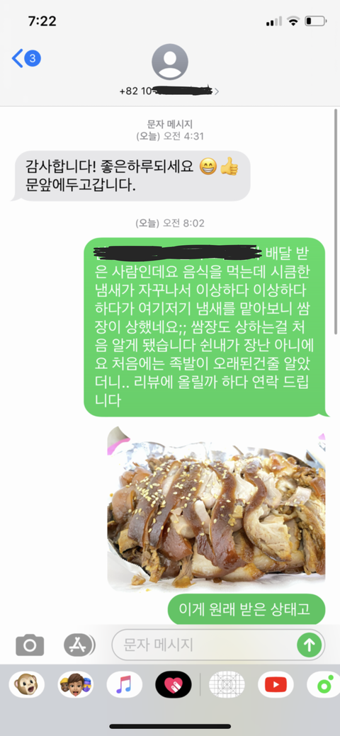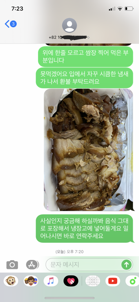 나: 어이가 없네요 상한 음식을 팔아놓고 아니라고만 말씀하시고 제가 예민하다고만 하시니.. 저희집이 전에 삼겹살 집을 했었는데 저희도 쌈장을 만들때 사이다와 이것저것 넣었지만 쉰내가 나지는 않았고 제가 아무리 예민 하다지만 쉰 음식도 구분 못하겠어요? 이렇게 나오실까봐 음식 그대로 포장해 두었으니 가져가서 보세요