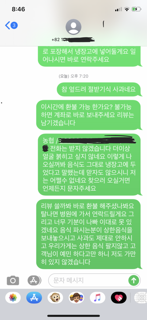 참 엎드려 절받기 식의 사과네요 라고 문자를 했더니 역시나 묵묵부답 할말 있으시면 문자로 얘기해 달라고 더이상 ㅇ얼굴 붉히고 싶지 않고 이시간에 환불이 불가능 하면 이체 해달라고 하고 리뷰는 적겠다 하니 그때부터 전화가 오더라구요 리뷰 적겠다고 하니 그제서야..