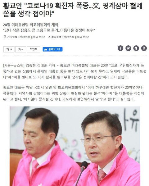 *현 미래통합당(구 자유한국당, 구 한나라당)은 이번 바이러스 확산에 대해신천G를 비난하는 말을 입에 단 한마디도 올리지 않고 있음.