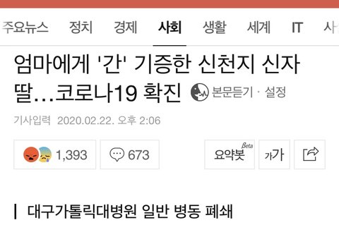 대구가톨릭대병원은 지난 18일 간 기증 수술을 받고 입원 중인 A씨(여)가 코로나 19에 감염된 사실을 확인하고 간이식 병동인 122병동을 폐쇄했다고 22일 밝혔다. A씨는 어머니에게 간을 기증한 수술을 받은 뒤 열이 떨어지지 않자 병원 측에 "신천지 교인"이라며 "보건소로부터 자가격리 대상자로 통보를 받았다"고 털어 놓은 것으로 알려졌다. 대구가톨릭대병원은 이단 신천지 교인인 간호사가 코로나19에 감염되면서 이미 응급실과 호흡기내과가 일시 폐쇄됐고 접촉한 환자와 의료진이 격리된 상태였다. 간 기증 수술환자마저 코로나 19에 감염된 것으로 드러나면서 자가격리 조치된 대구가톨릭대병원 의료진은 106명,환자도 40여 명에 달한다.