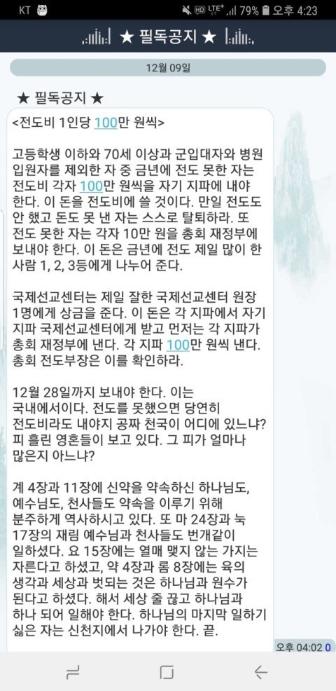 저도 신천지에 포교당해서 약 두달간 교육들었는데 똑같습니다 벌금강요에 지능적인 접근까지.. ㅋㅋ진짜 웃기지도 않음 카페에 짝꿍(잎사귀) 신천지 언니들 있는데 어떤 대학생 여자분이 이분들 안믿으면 큰일날거라고 말하고 사라짐 ㄹㅇ 꽁트도 이런 짜고치는 꽁트가없음;