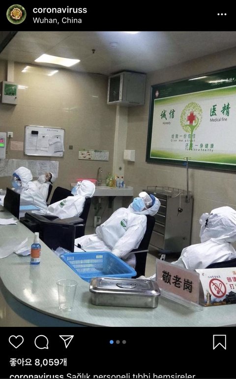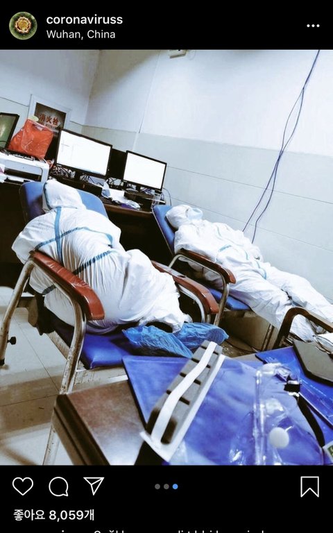 우한시? 병원에서 의사, 간호사들 다 마스크랑 고글끼고 있고 맨 마지막 사진 보면 각자 자리에 비닐 덮어놓고 작업하는중 의사분들 바닥에서 자는거 보고 찡했다...