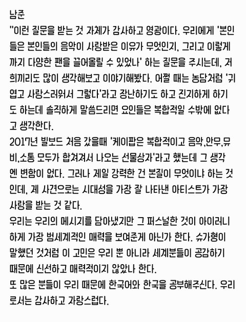 "우리는 우리의 메시지를 담아냈지만 그 퍼스널한 것이 아이러니하게 가장 범세계적인 매력을 보여준게 아닌가 한다."