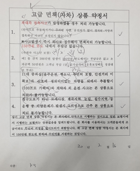 고급면책(완전자차) 보험들었으나 차대차 사고만 된다고 했습니다.