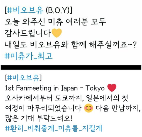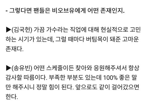 국헌이 유빈이 둘다 정말 실력도 좋고 지금까지 말한대로 팬사랑도 넘치는 예쁜 사람들이라 많이들 알아줬으면 좋겠어! 비오브유,김국헌,송유빈 다들 기억해줘 긴 글 읽어줘서 고마워ㅎㅎㅎ