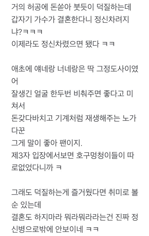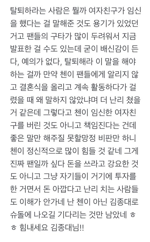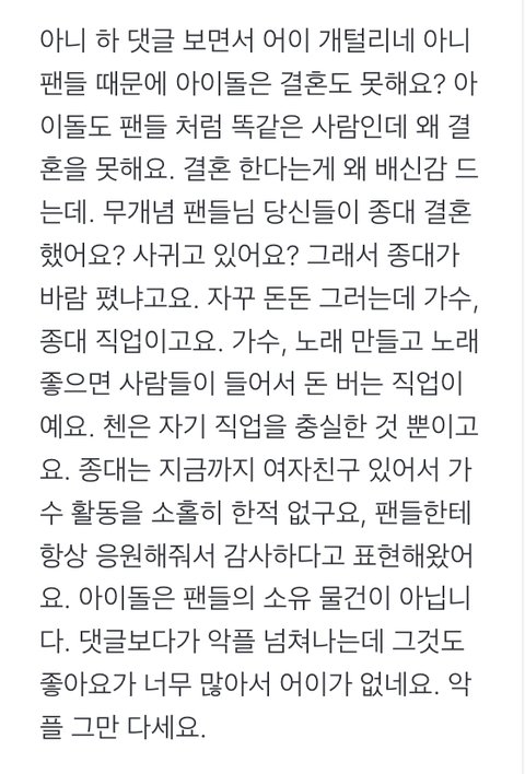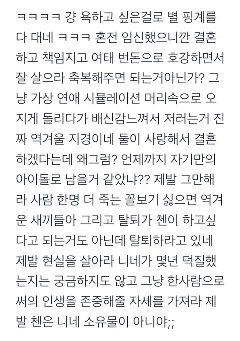 우리가 쟤 여친를 16년부터 알았는데 무슨 유사연애로 배신감 느껴서 욕하는거래ㅋㅋㅋㅋㅋㅋ 아무도 쟤로 유사 안먹었어요ㅠㅠ 김종대가 우리한테 유사 먹였지(그럼에도 아무도 안먹음) 아형나와서 자긴 팬싸남친이라고 할때부터 띠용이었구만