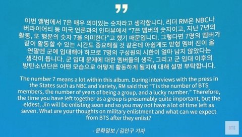 지금까지 방탄의 모든 멤버들과 빅히트는 입대 관련 질문이 나올 때마다 꾸준히 병역은 당연한 의무이므로 국가의 부름이 있다면 가겠다고 얘기해왔음