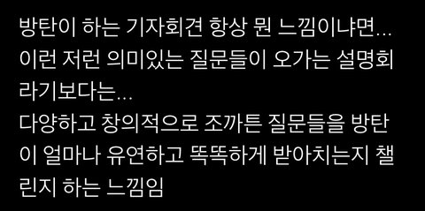 근데 저 기자간담회가 무슨 간담회? 해외에서도 관심 가지고 앨범의 제작 과정 등 앨범에 대해 분석하고 설명하고 질문하는 "ON 앨범"에 대한 간담회란 말임 그냥 니네 궁금한 거 물어보셈~ 하는 Q&A 가 아니다 이 말임 저건 걍 지 개인적으로 궁금한 걸 물어본 거랑 뭐가 다름?