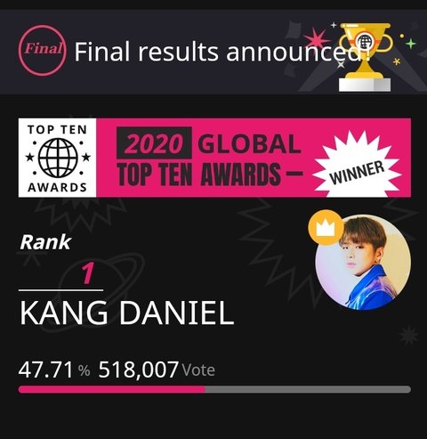 1위 강다니엘 ㅊㅋㅊㅋ❤