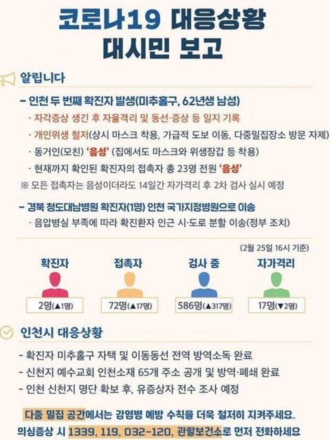 인천 두번째 확진자 모범대응으로 어머니 음성. 접촉자 23명 음성이래요.