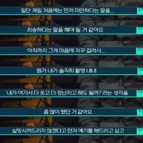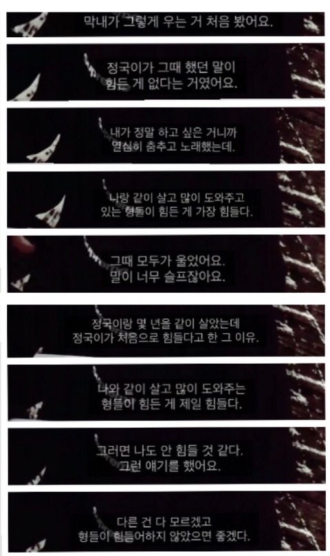 “나를 어릴때부터 도와주고 챙겨준 형들이 힘든게 제일 힘들다 나는 형들이 힘들지 않으면 다 괜찮을것같다”