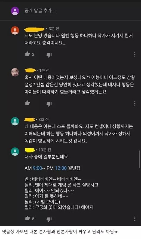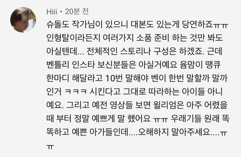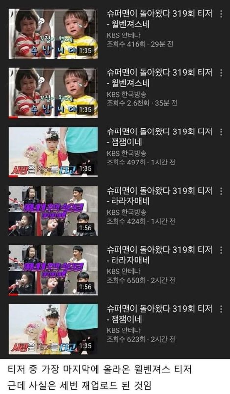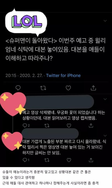 와 ㅋㅋ 이거 봐봐.. 나 진짜 슈돌 좋아했는데 이거 보고 이제 슈돌 못 볼것같아. 여태까지 애기들이 했던 행동이 순수해서 나온 행동일줄 알았는데 작가들이 대본 짠거라거 생각하면 못봐주겠다. 윌리엄 혹쉬~? 좋아했는데 그것도 작가가 의도한거면 진짜 나 울어