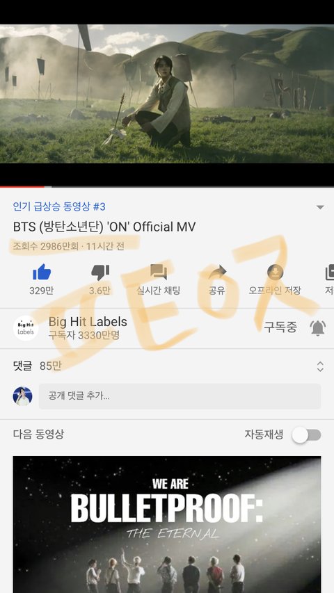 방탄들도 실망하고 있을텐데 우리가 할 수있는 걸로 기록 만드는 걸로 화풀이하자 벌써 3천만이니 1억뷰도 가능할거야 이삐들 화이팅!