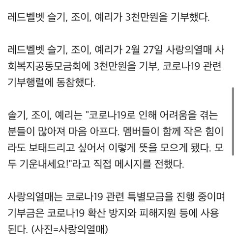 슬기, 조이도 예리랑 같이 기부해서 레드벨벳 총 기부액 3천만원이래 레드벨벳 멤버들 각자 천만원씩 낸듯